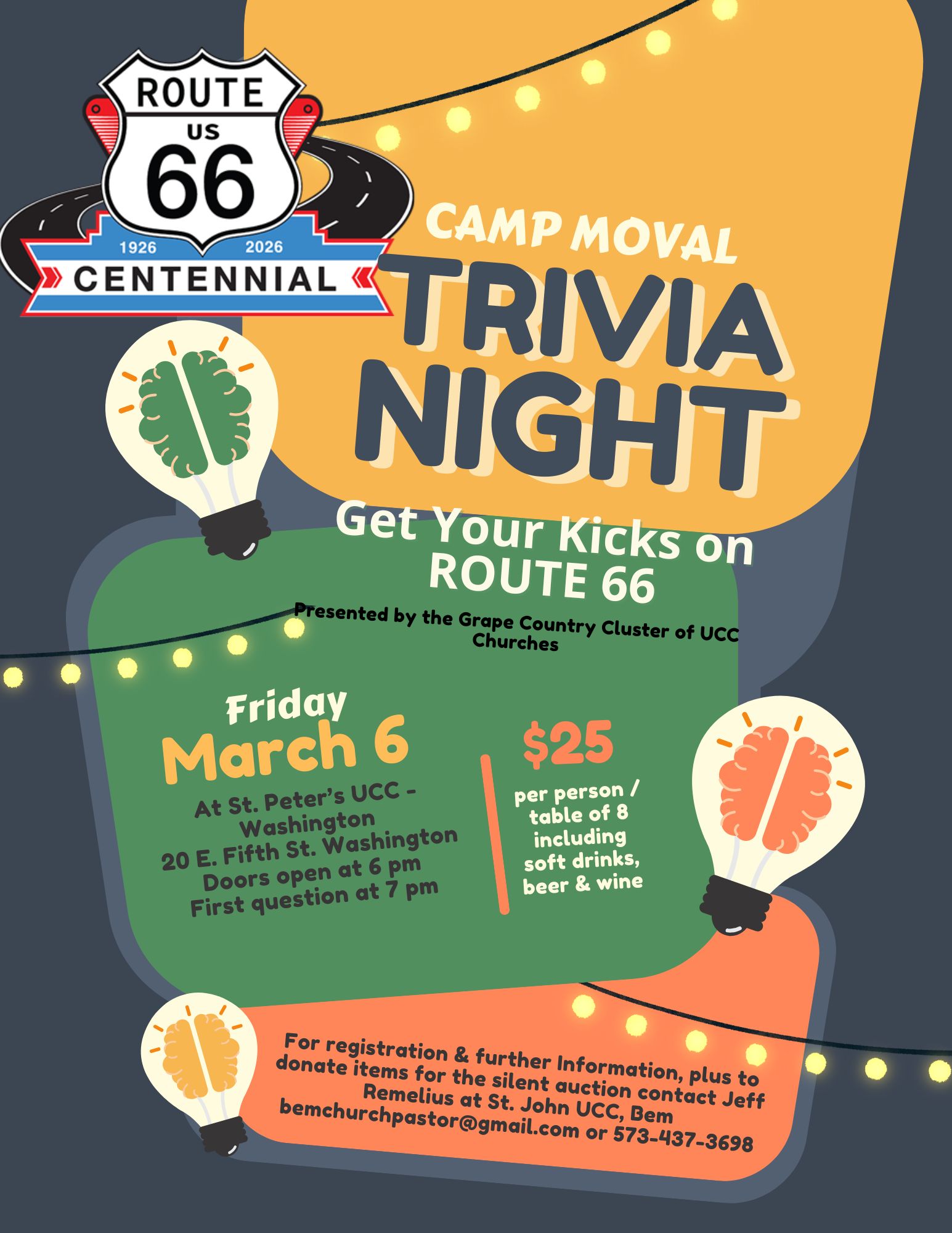 Support the UCC’s local retreat, Camp MoVal, and have fun all at the same time!Join other UCC friends for a Trivia Night on Friday, March 6th at 7 pm at St. Peter’s UCC Washington