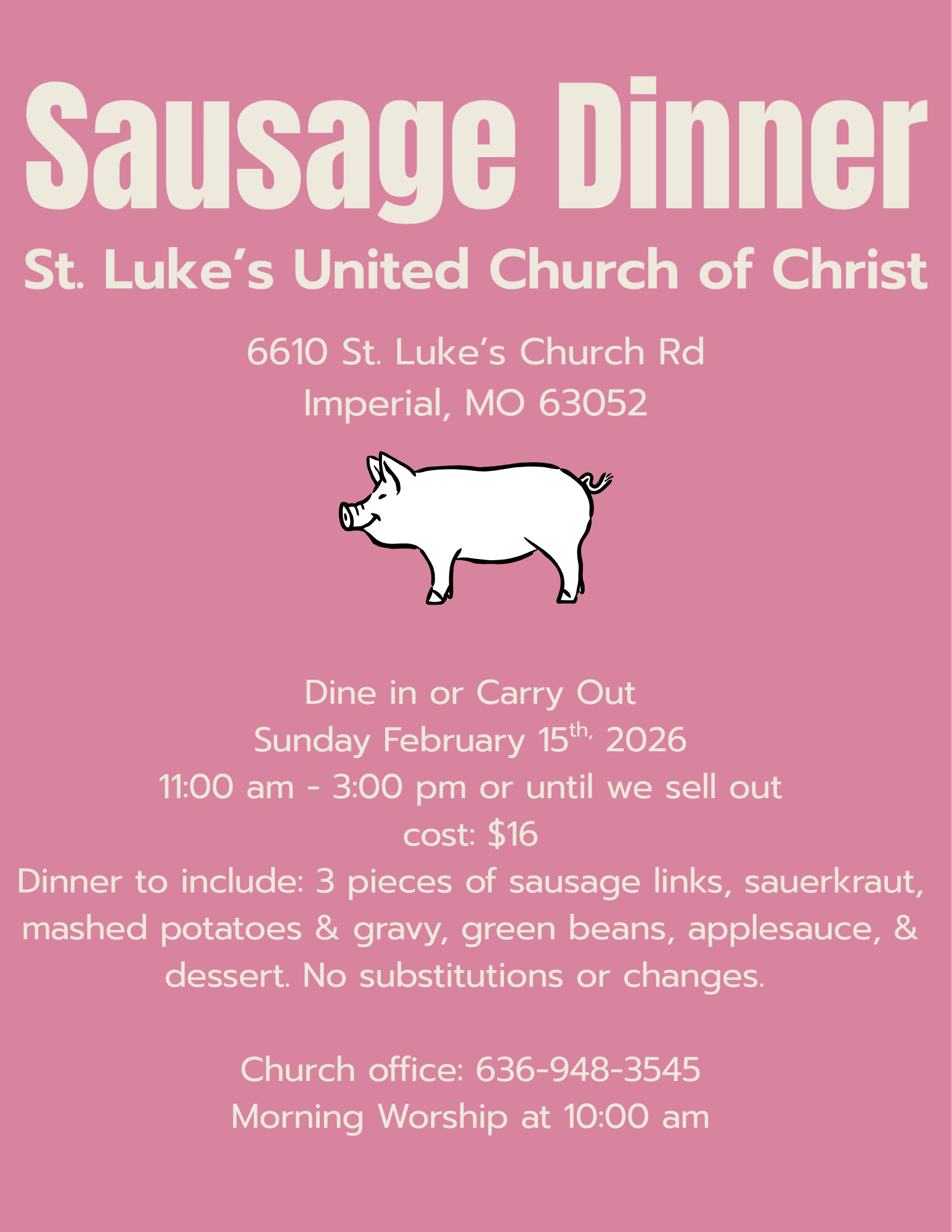 St. Luke’s UCC Annual Sausage DinnerFeb 15 –11am-3pm $16
